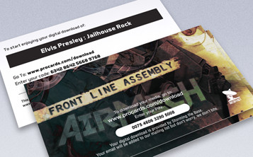 With your order in place we’ll go ahead and print your download coupons. They feature clear download instructions, a web address where your coupons can be redeemed and a unique download code. For a quick and easy setup you can opt for our instant ProCards design or you can use our templates to supply your own custom artwork. We'll even deliver them direct to your vinyl manufacturer.